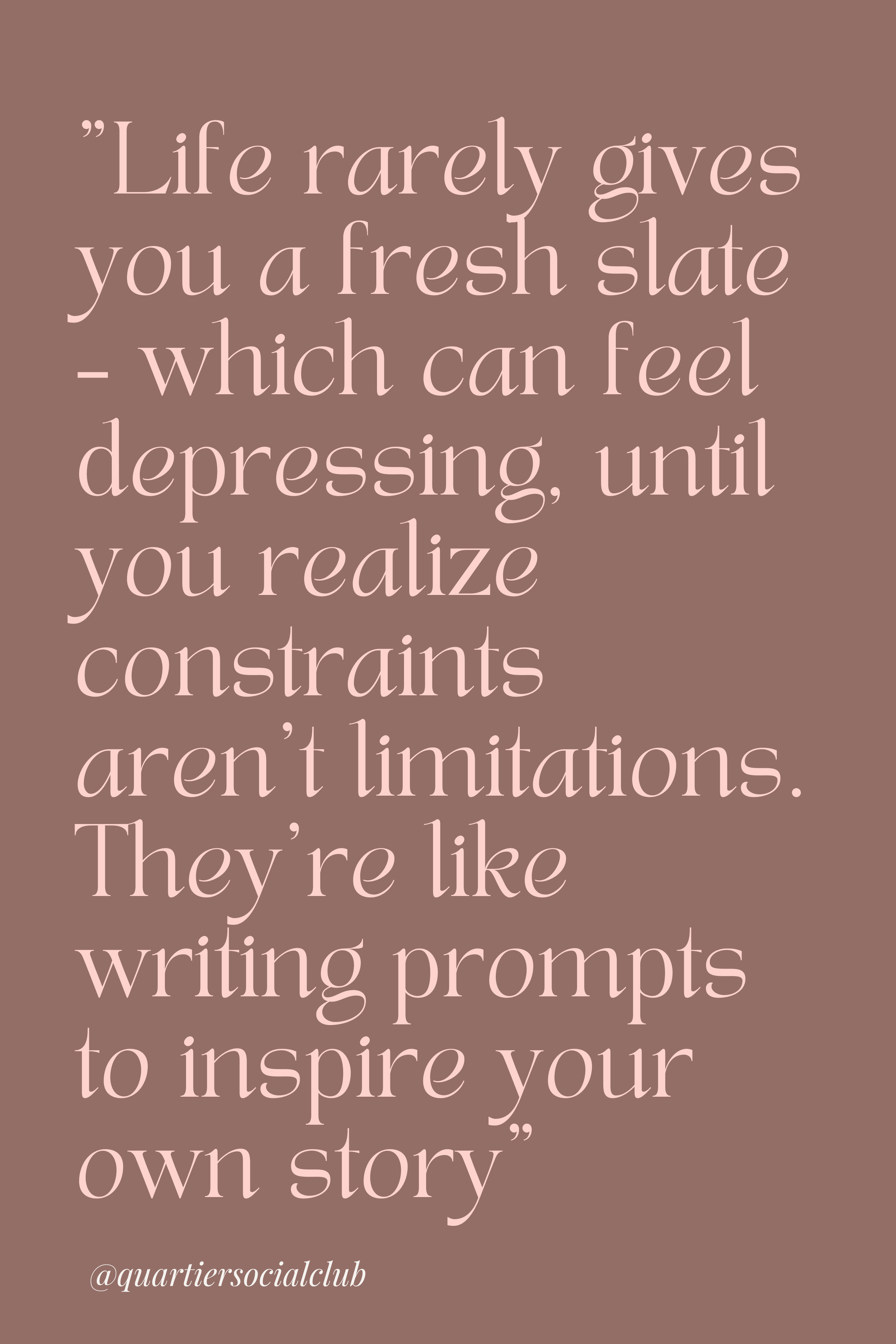 34. “Life rarely gives you a fresh slate — which can feel depressing, until you realize constraints aren’t limitations. They’re like writing prompts to inspire your own story.” — Quartier Social Club